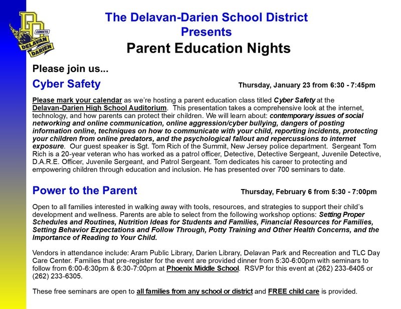 The Delavan-Darien School District is hosting two Parent Education Nights. Please see the attached information.